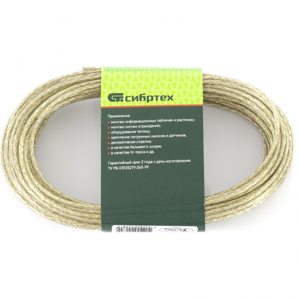 Металлополимерный прозрачный трос ПР-3.0 Сибртех 47628 толщиной 3 мм,используется для монтажа рекламных баннеров и воздушных кабельных линий, установки ограждений, палаток, теплиц, погружения скважинных насосов и датчиков. Применяется в качестве садового троса-шнура для подвязки растений, а также может служить для развешивания белья. Жила шнура изготовлена из стальной проволоки, поэтому он выдерживает значительные нагрузки.