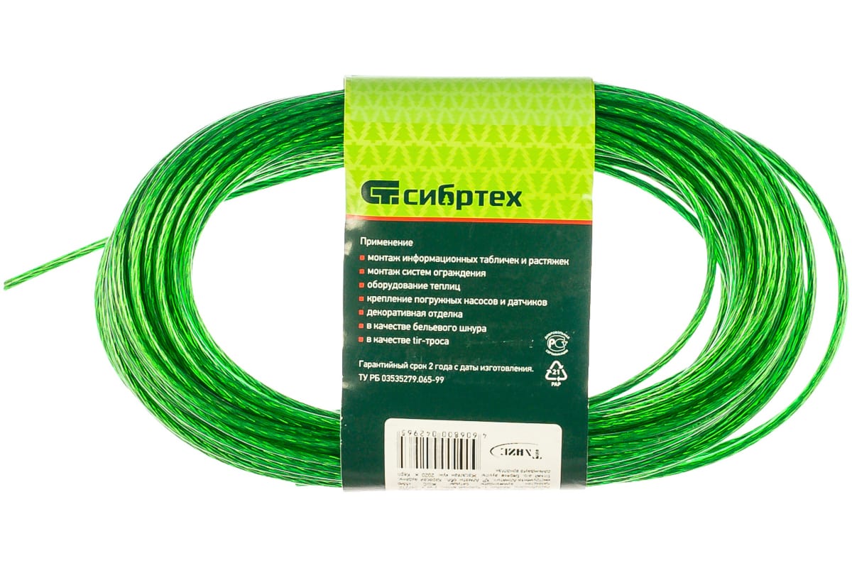 Трос металлополимерный ПР-3.0 Сибртех 47647 зеленого цвета, толщиной 3 мм, моток 20 м. п., используется для монтажа баннеров и рекламных растяжек, погружения скважинных насосов и датчиков, установки тентов и теплиц, а также в качестве пломбировочного троса. Может выполнять функцию садового шнура для подвязки растений, устройства ограждений, а также применяться в качестве троса для белья. Благодаря покрытию из пластиката ПВХ изделие устойчиво к истиранию, коррозии, УФ-излучению и перепадам температуры, что увеличивает срок его службы.